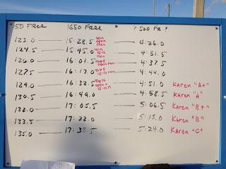 On Tuesday November 27, I had a group of athletes do a freestyle set. Here's how it went: 10x: 150 Fast Free + 150 easy choice .....the whole 300 was on (4:00) I put this up on the white board at the beginning of practice: The 150 Pace goals correlate pretty accurately with the 1650 paces (minus one second for the hand touch we did -- not going to the feet). The 500 times were made up by me on the spot, and basically were there for the two athletes...